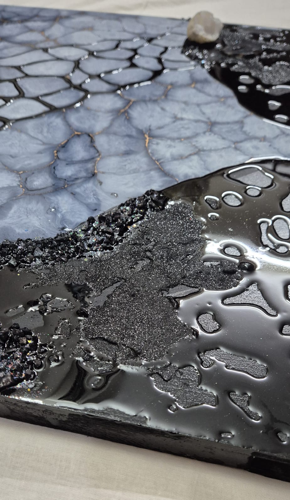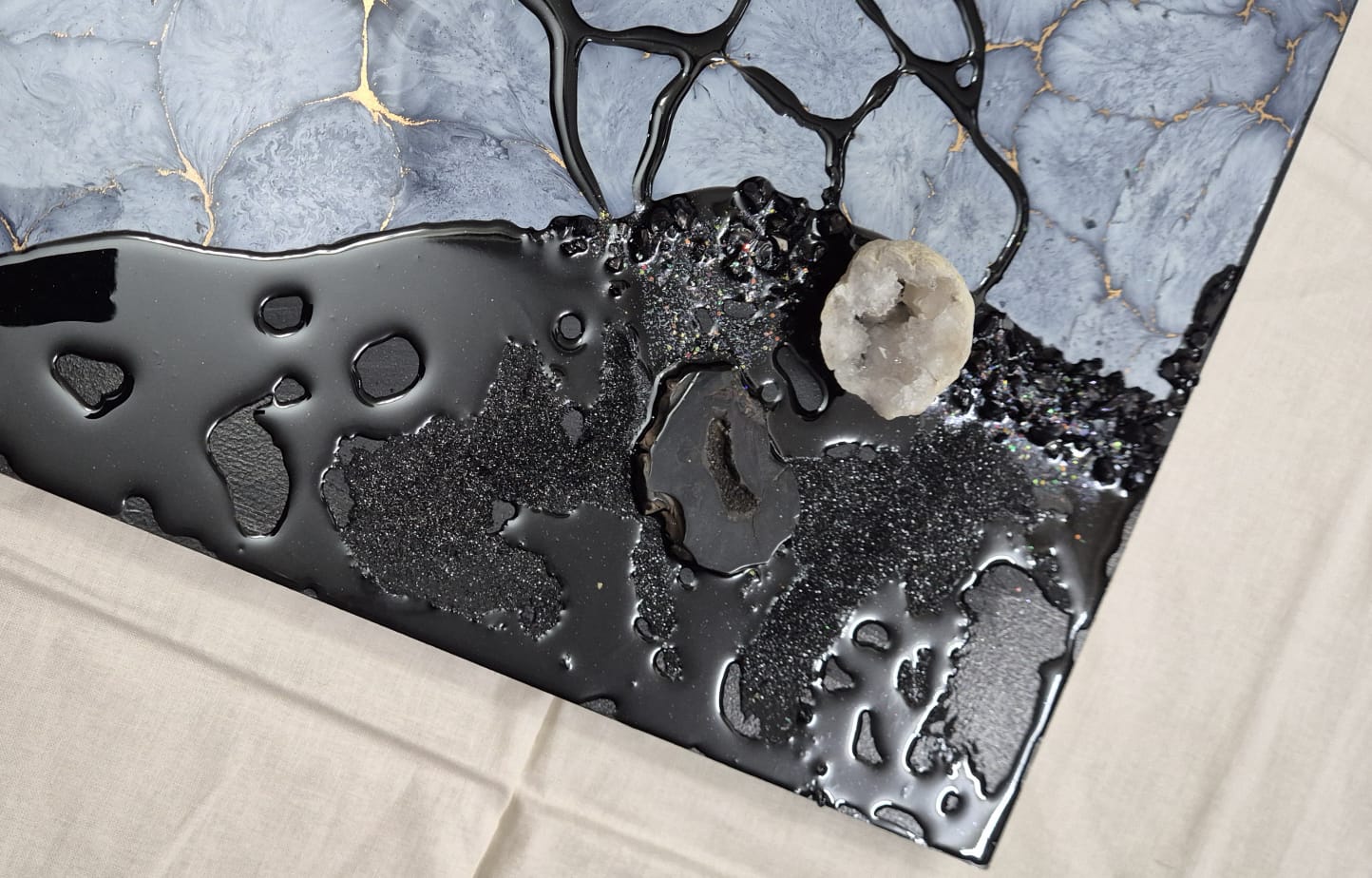 This 3 ft x 2 ft resin wall hanging utilizes the pebble technique to create a mesmerizing blue-gray, vein-like pattern fractured by delicate gold accents, giving it an agate-like appearance. The composition is dramatically contrasted by sections of heavy black texture paste and glossy black resin, which are richly embedded with natural pyrites and crystals for a stunning, tactile, and abstract finish